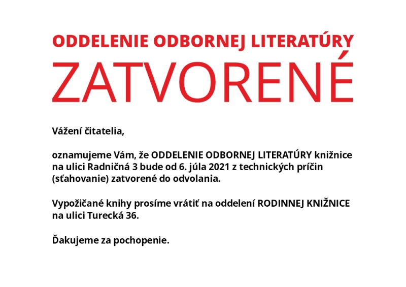 oznamujeme Vám, že ODDELENIE ODBORNEJ LITERATÚRY knižnice na ulici Radničná 3 bude od 6. júla 2021 z technických príčin (sťahovanie) zatvorené do odvolania.